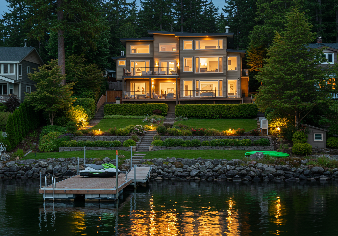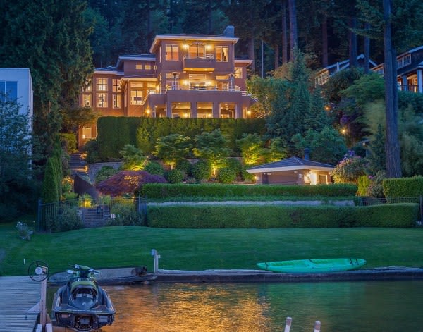 A magnificent gated waterfront estate, elegant yet warm, comfortable and lushly landscaped. A cascading garden Koi pond surprises your guests and enchants your arrival! 70 feet of low bank waterfront has year round deep water moorage.