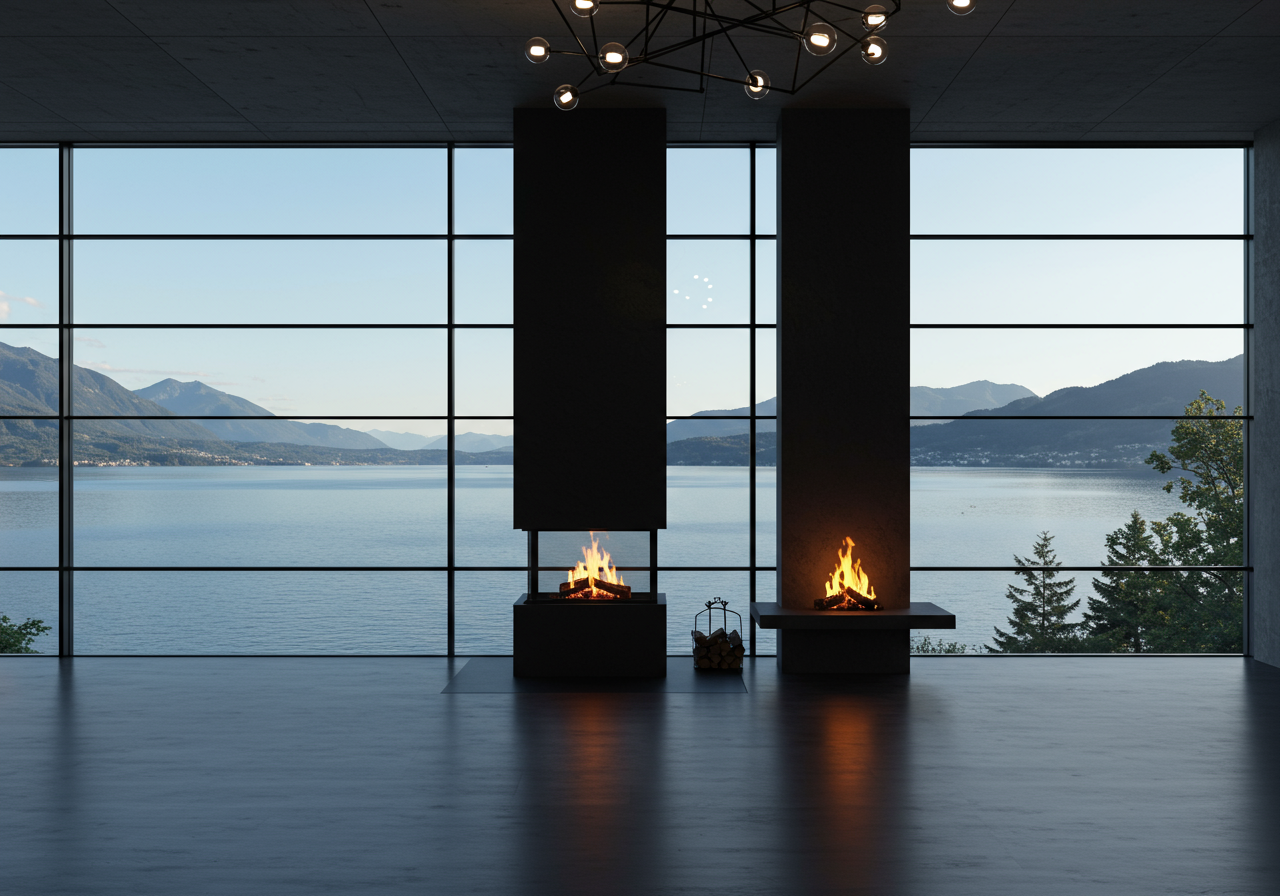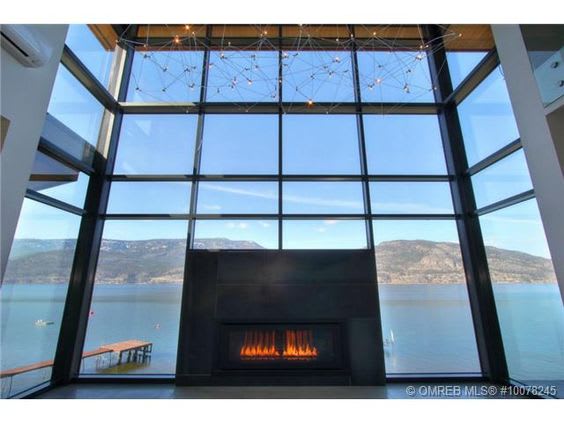 A fireplace set within a wall of glass with views of a lake and the Canadian mountains.
